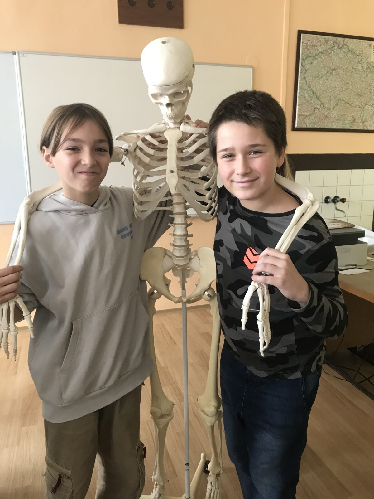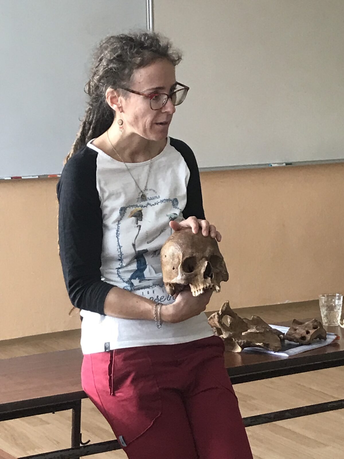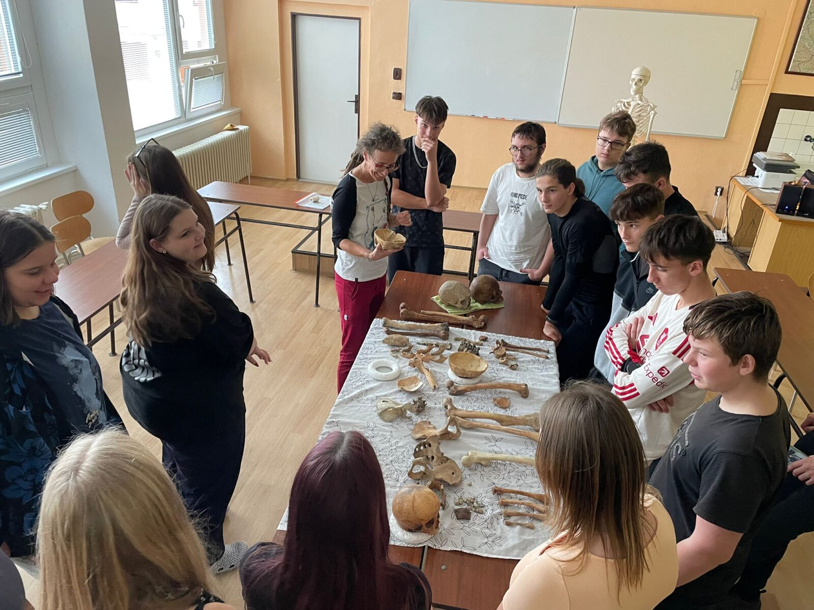 Antropoložka přivezla pestrou ukázku kostí – dětských i dospělých, zdravých i nemocí nebo úrazy poznamenaných. Děti mohly vidět kosti se zhojenými zlomeninami i kosti, na nichž byly patrné stopy nemocí, například tuberkulózy. Odbornice vysvětlila, jak lze z kostry zjistit věk, pohlaví či výšku člověka, ale také to, jaké nemoci prodělal nebo jaké fyzické zatížení jeho tělo snášelo.