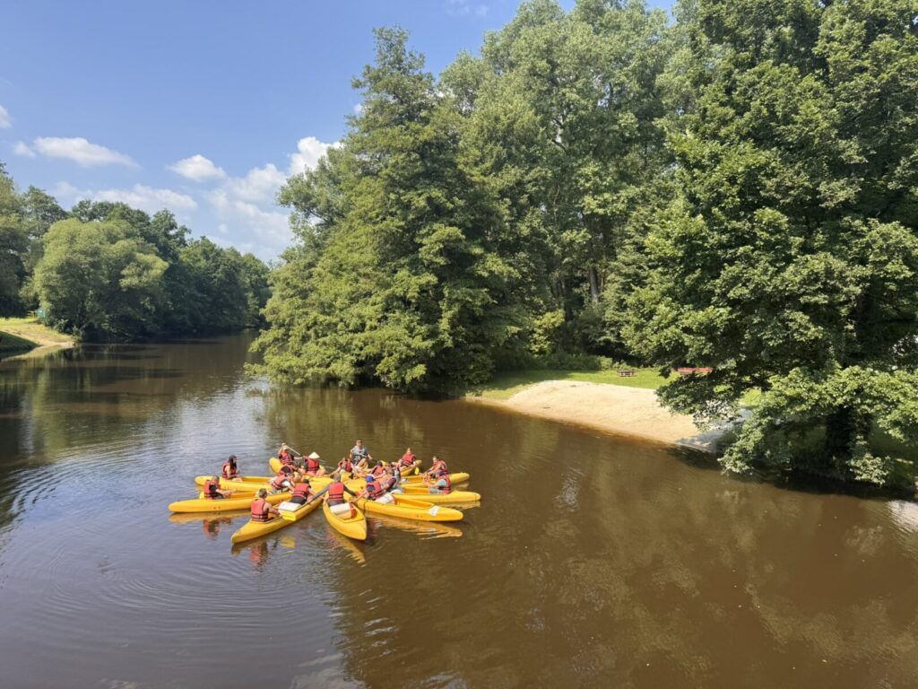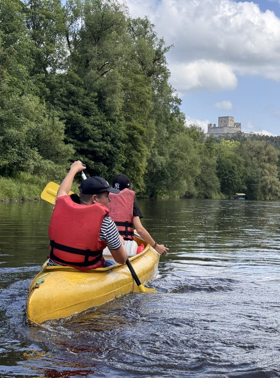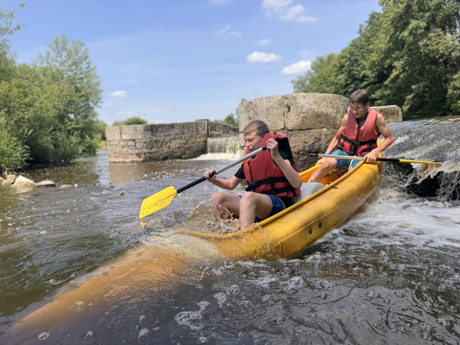 Druhý den nás čekala plavba z Horažďovic do Katovic, úsek plný jezů a tedy náročných volejů, jedinou odměnou byly sjezdy šlajsen. Stín jsme si ten den moc neužili, takže se nám kolena, ramena i zátylky zbarvily do růžova. Večer jsme si užili krásný vodácký kemp v Katovicích, který opravdu vřele doporučujeme. Ve čtvrtek ráno jsme již zkušeně sbalili stany a nasedli na kánoe jako první. Užili jsme si tak krásnou řeku, na které jsme byli úplně sami.