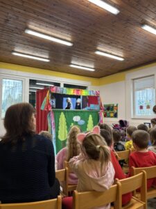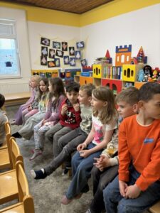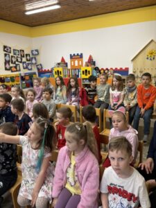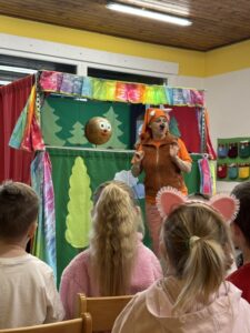 Ve středu 15.dubna využili prvňáci nabídku kamarádů ze školky a vydali se za nimi na divadelní představení. Pohádka O koblížkovi se všem líbila, a protože se jim nechtělo hned do školy, tak si ještě zahráli společně i několik her, aby se lépe poznali. Cestou ze školky zvládli i návštěvu skvělého dětského hřiště v Kravařích. Krásný den nakonec vyjádřili obrázky.