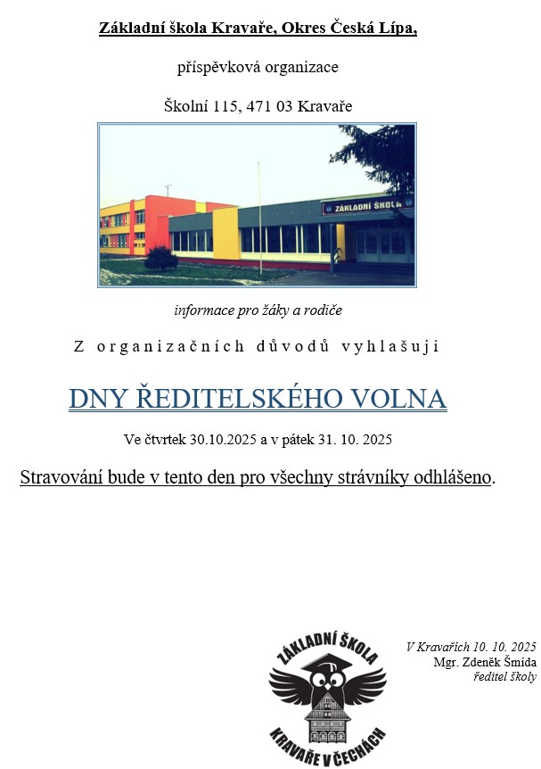 Z organizačních důvodů vyhlašuji na čtvrtek 30.10. a pátek 31.10.2025 dny ředitelského volna. Za komplikace se předem omlouvám.