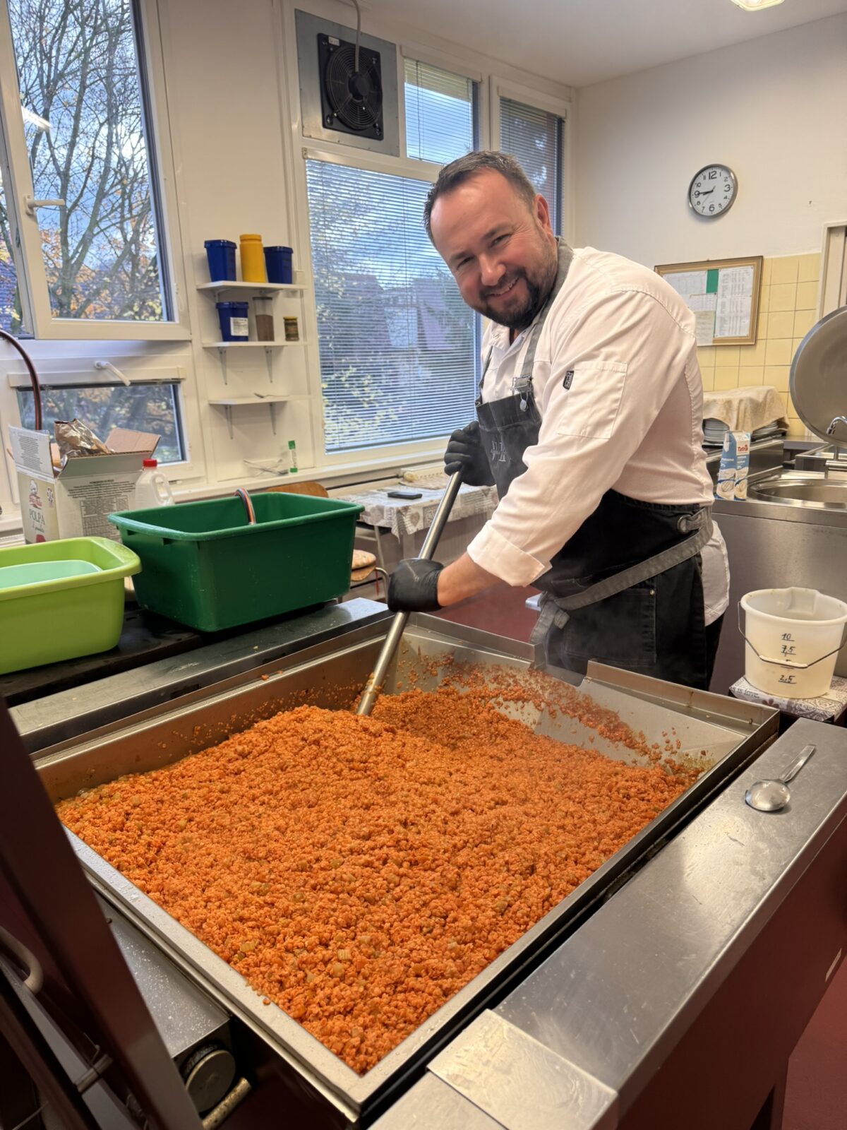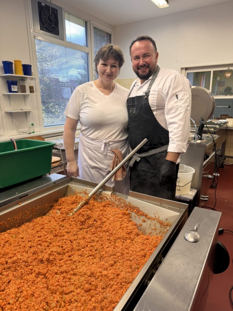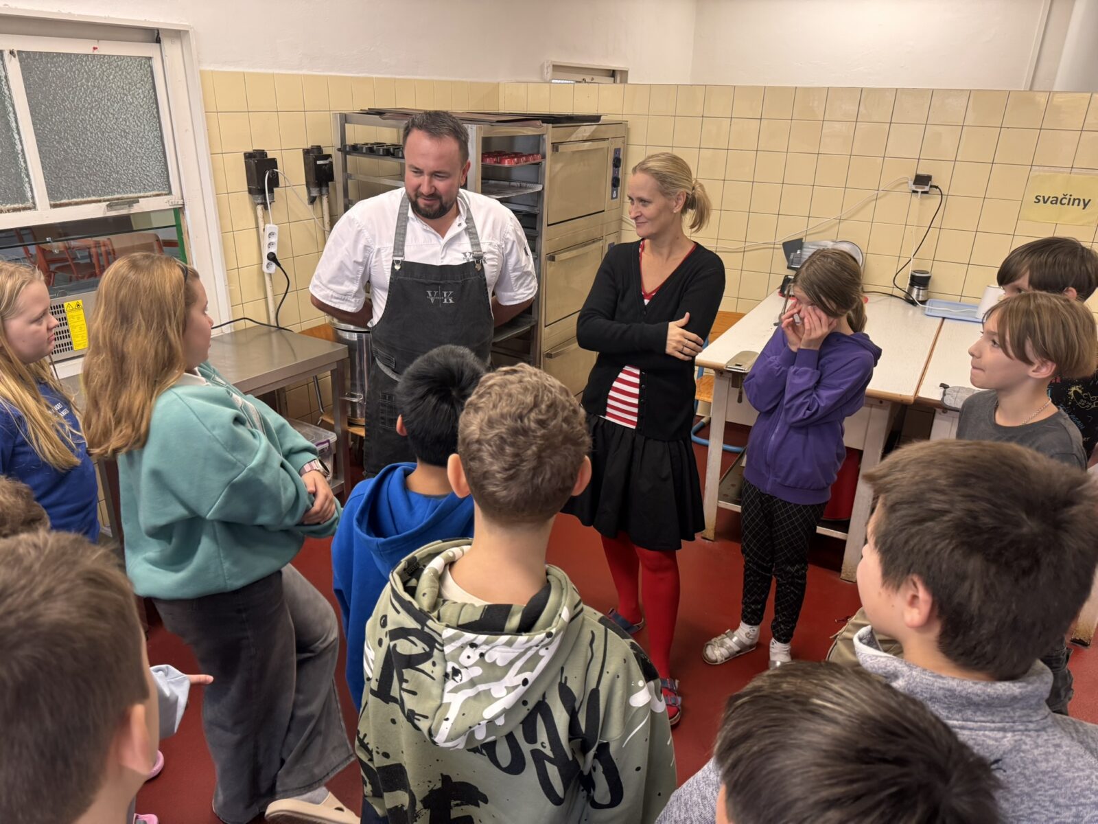 Dva dny s námi strávil a hlavně vařil ve školní kuchyni pan Vítek Kudrna, šéfkuchař profesionál s obrovskou zkušeností, skvělými nápady, úžasným humorem a příjemným lidským přístupem. Nepozvali jsme si ho, protože by naše kuchařky paní Jirásková a Fárová neuměly vařit, ale proto, že každá nová zkušenost je dobrá, pohled jiného kuchaře může otevřít nové možnosti a nakonec jistě i byla šance okoukat nápady, vychytávky, drobné dovednosti usnadňující tu velmi náročnou a obtížnou práci, kterou vaření ve školní kuchyni jistě je.