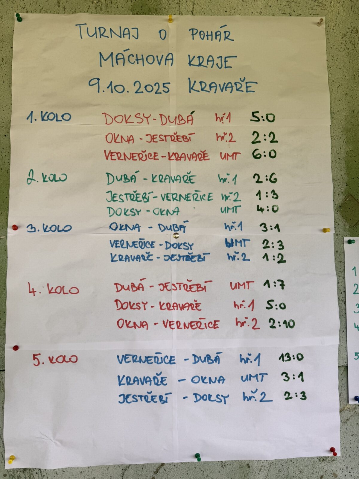 Ve čtvrtek 9. října 2025 jsme oživili fotbalový turnaj žáků 1. stupně škol Máchova kraje zvAný Máchův pohár. Kdysi to byla tradiční a každoroční sportovní událost na kravařském hřišti, překazil nám ji až Covid. Děkuji paní učitelce Němečkové ze základní školy ve Verneřicích, která se mi před časem ozvala s informací, že mají u sebe stále velký putovní pohár pro vítěze z posledního ročníku v roce 2018 a jestli bychom turnaj nechtěli obnovit. Chtěli! Ve čtvrtek 9.10. zázračně přestalo pršet, přijeli žáci z Jestřebí, Doks, Oken, Verneřic, Dubé a samozřejmě nechyběl tým domácích z Kravař a hrál se fotbal.